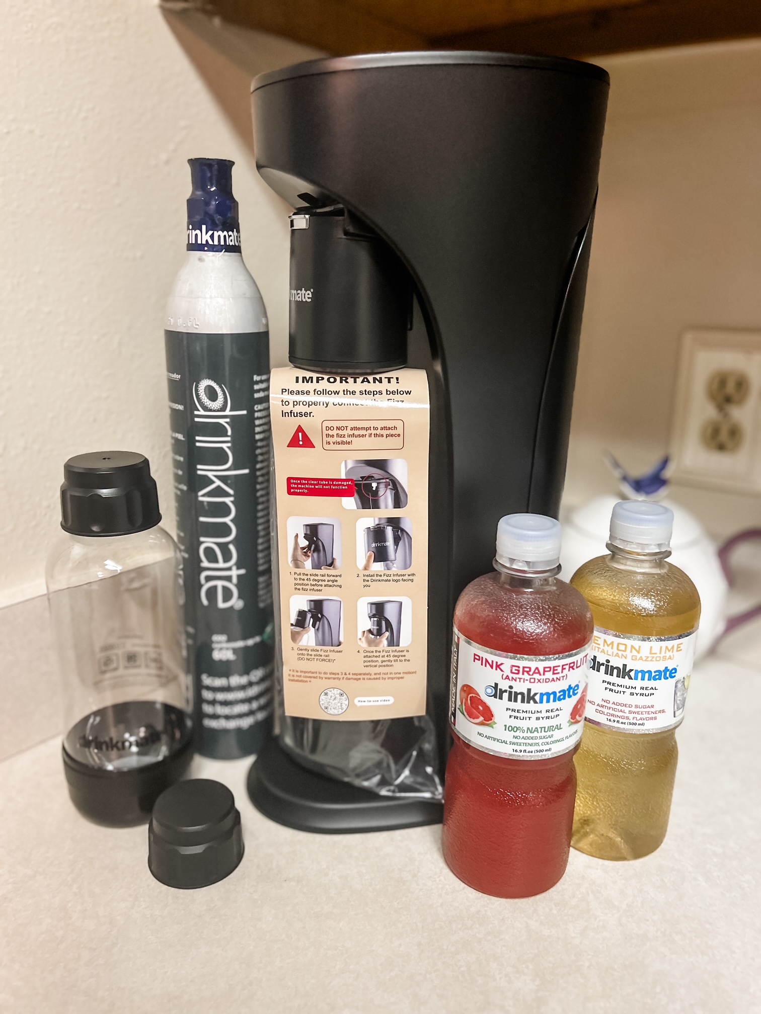 The bundle included the machine, a CO2 Cylinder, (2) plastic bottles, and (2) flavored drinks – Lemon Lime & Pink Grapefruit. The instructions were pretty straightforward, but there are a few warning labels since you’re dealing with a CO2 Cylinder.