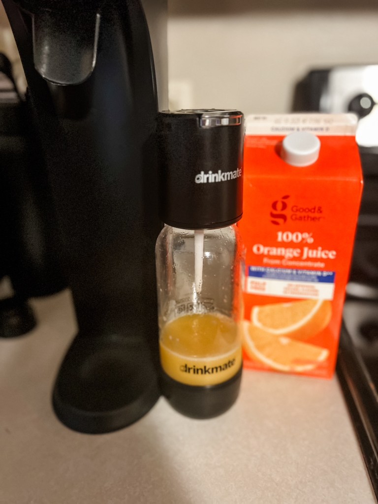 Next, we tried using our own drink -we decided to give orange juice a shot (it just suggests not to use anything with pulp). This was a little more tasty, it kind of gave it an orange marmaladey type feel. I will say that if you give it too many pumps, you will add way too much gas and the drink will be super foamy and taste like straight CO2. So make sure to just give it a few short taps. Also, the lid will be on super tight once you pull it off the machine, so you will want to pull up the release valve to let some air out before twisting off the top.